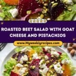 5. Assemble the salad: Divide dressed greens onto plates or a serving dish. Arrange roasted beet chunks over the top, sprinkle with goat cheese crumbles and chopped pistachios. Drizzle remaining dressing over the finished salad.